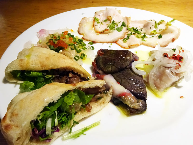 牛肉のパニーニ、茄子のマリネ、カルパッチョ、ポークハムなど。