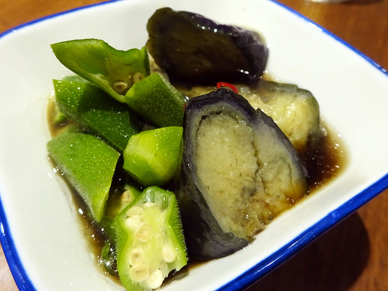 大阪の夏の代表食材、水茄子とハモ、同じく大阪産(おおさかもん)の春菊が使用され、見た目も涼しげな一皿。