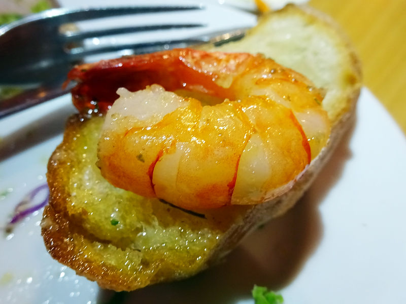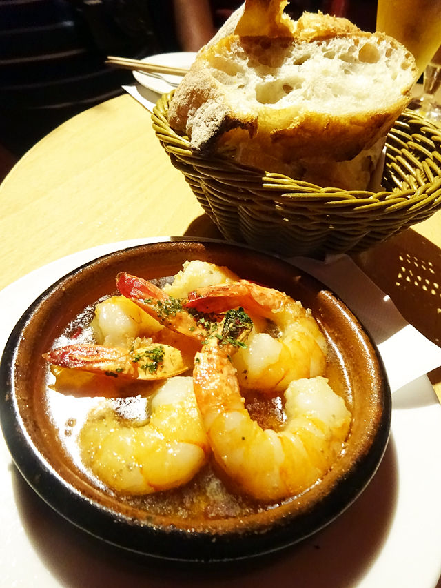 おっきな海老!ぷりっぷり〜っ!たっぷりオイルはバゲットでぬぐって。