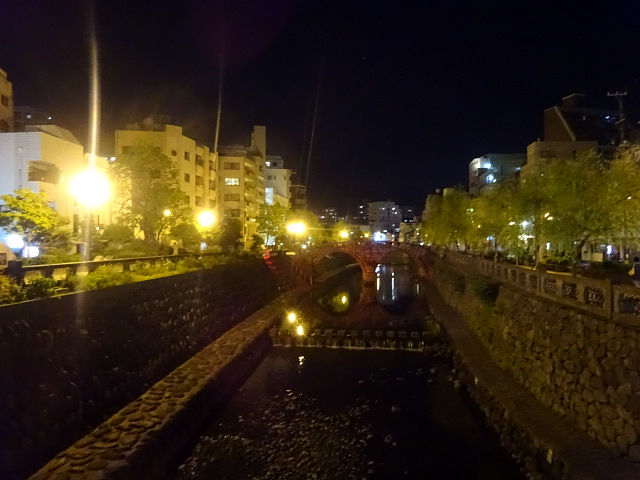 長崎観光名所のひとつ。中島川にかかるアーチ形の石橋。橋のアーチと水面に映る影とで眼鏡に見えることから名付けられたそう。