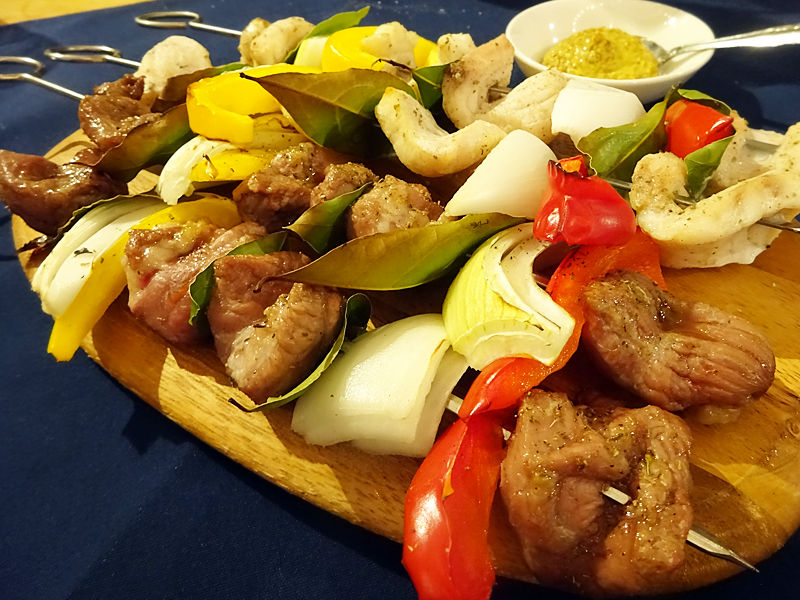 長さ30cmの鉄串に刺された肉&魚&野菜の豪快な一品。