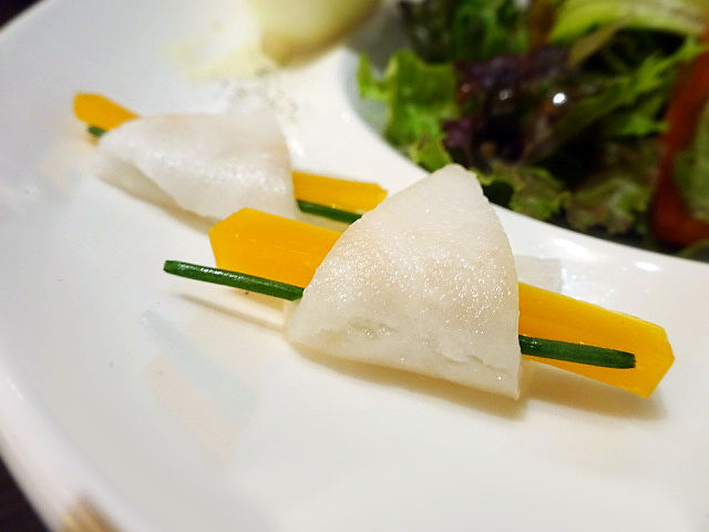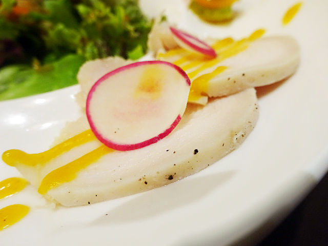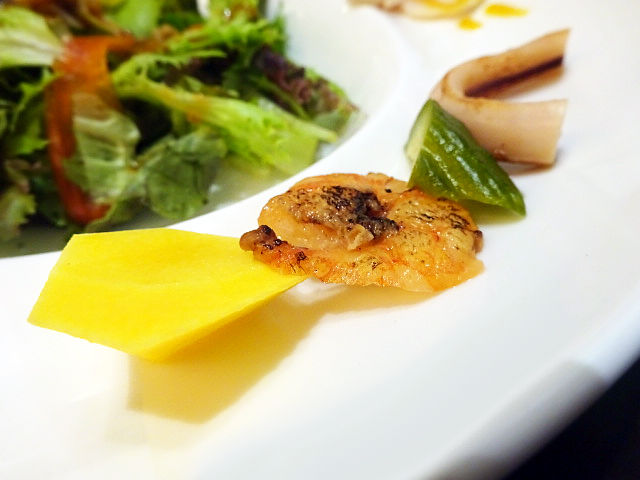 打って変わってガラスのお皿で涼しげな演出。肉厚なサーモンに、カラフルなソースと太い胡瓜でさわやか。