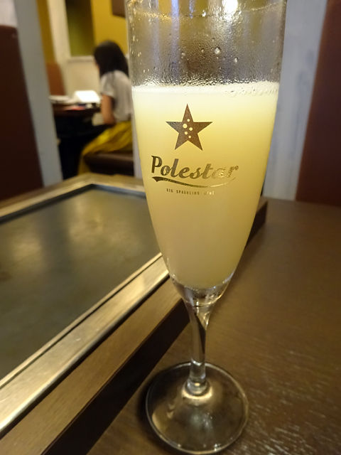テーブルの鉄板がはめ込まれた席に座った人は「鉄板奉行」に任じられます。運ばれてくるお料理を取り分けたりするため、ドリンクのサービスが受けられるんだって!で、それがこちら。生姜+ユズ+リンゴのとっても爽やかなドリンク。飲み食べする前にもピッタリだ!