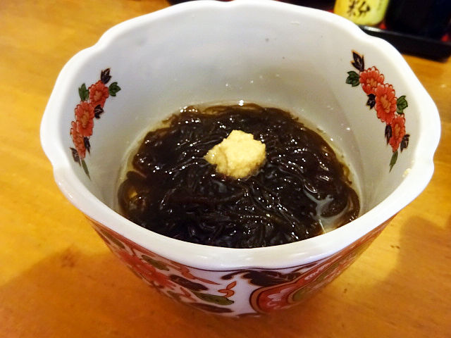 とりあえずの一品から。胡瓜としらすの酢の物を所望するも売切とのことで、酢つながりで、もずく酢。