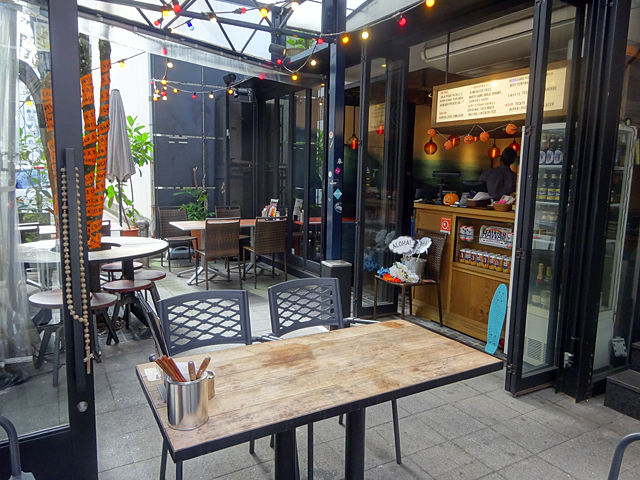 入ってすぐはオープンテラス席。店内は丸テーブル席とソファ席。外から光が射し込む開放感溢れる空間です。