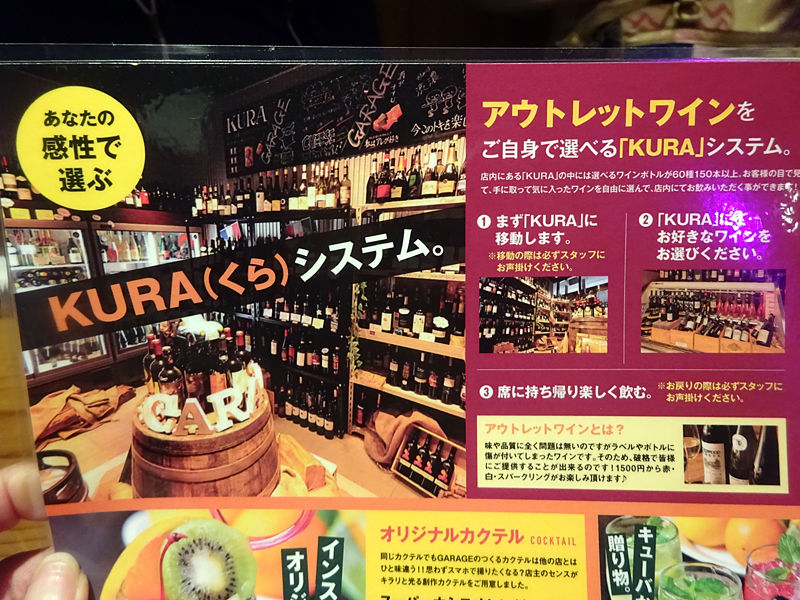 豊富なワインは『KURA』で見て手に取って自分で選ぶシステム。品質はそのままに、ラベルやボトルに傷が付いてしまったアウトレットワインゆえ、低価格で楽しむことができるんです!赤白泡が¥1500〜揃うそう!破格!