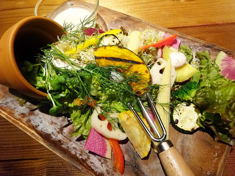 菜園の如く、植木鉢から多種の野菜が溢れ出し、トング代わりにショベルが添えられる、ワクワクしちゃうサラダ!