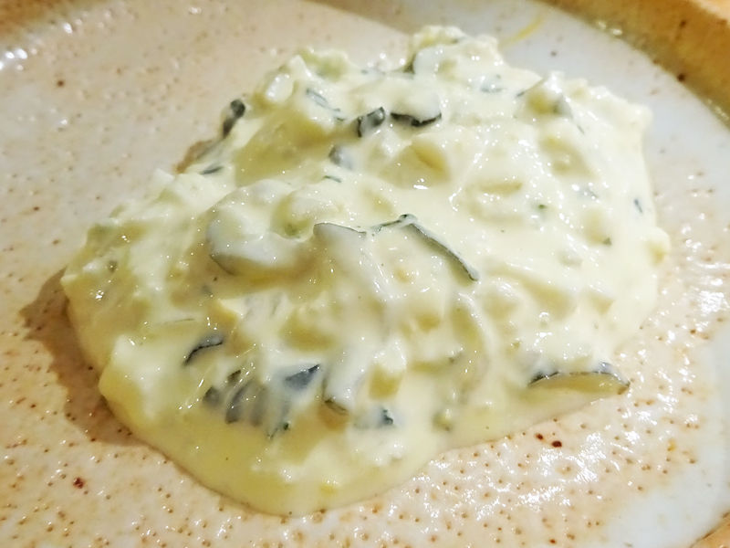 合わせる自家製タルタルソースは柴漬けや奈良漬け、茗荷、大葉などが入ってめっちゃ美味しいー!これだけでも美味しい〜