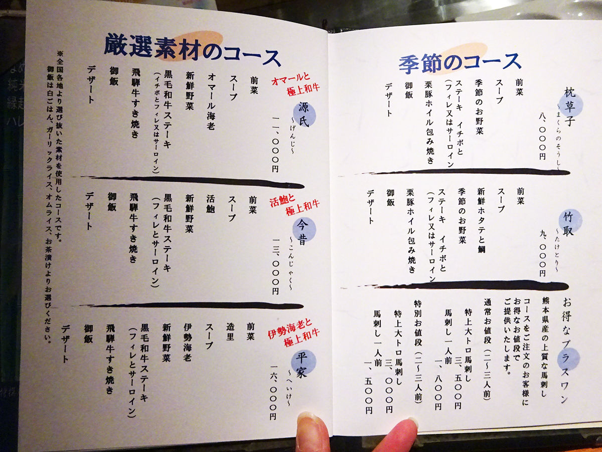 お料理は要望に応じてアレンジもしてもらえるとのことで、源氏コース¥11000をベースでお願いしました。