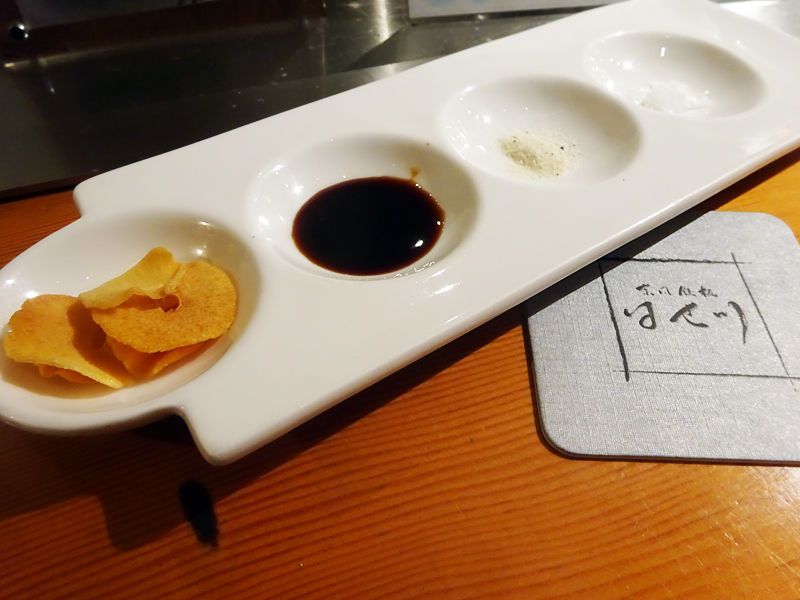 結晶塩、利尻昆布のお醤油やニンニクチップをお好みで。