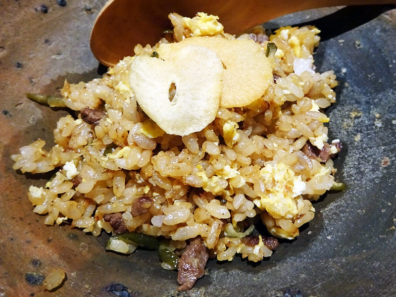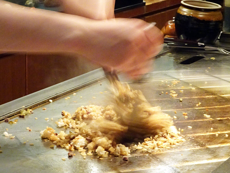 鉄板焼きの〆はやっぱりガーリックライス。こちらも華麗な手さばきでチャチャチャッと仕上げられます。