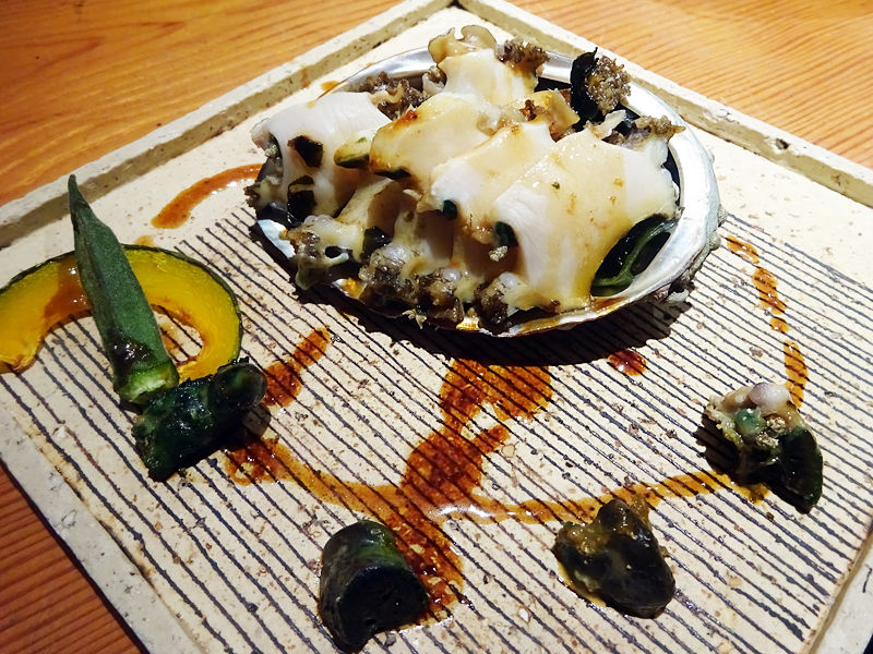通常コースではオマール海老1匹ですが、アレンジで海老を半分にしてアワビをプラス、シェアでいただくことに。