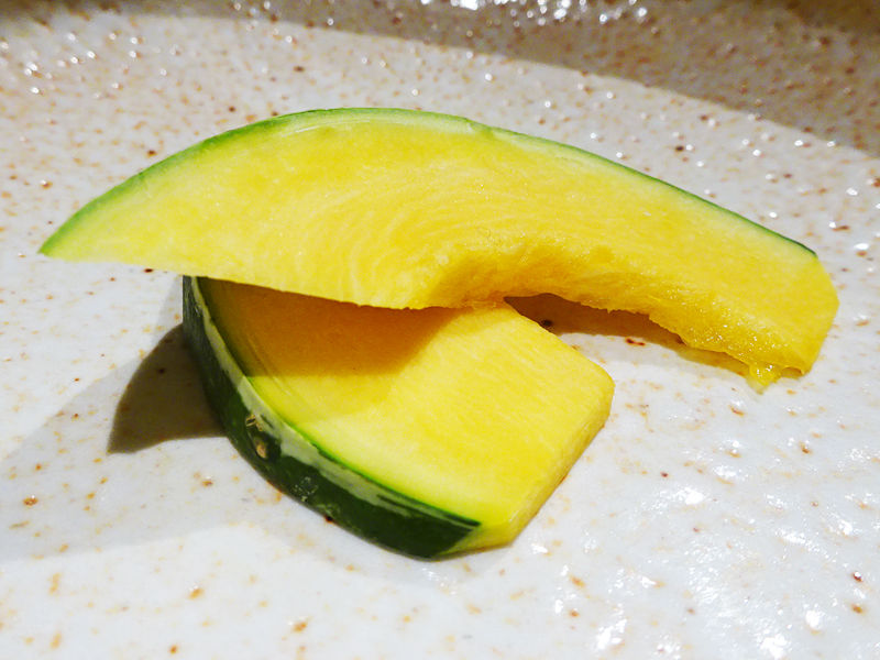 添えものの鈴カボチャ。「生でも食べられますよ!」とお味見させて頂きました。生だとコリリッと歯ごたえにキュウリっぽい味でおもしろかった。