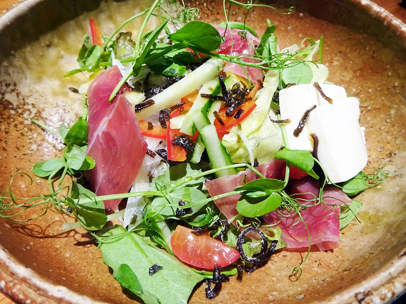 京豆腐とイタリア産プロシュートに、ピーテンドリルという名の、スナックエンドウのスプラウト。オリーブオイル&塩昆布でさっぱりと。