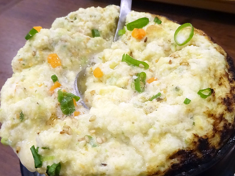 他店と違い?水の代わりに出汁を使ってしっかり濃い味。フチの部分はおこげもできて、ふわほあとカリッとした部分、食感の違いも楽しく、香ばしさも良い!ウマイ!