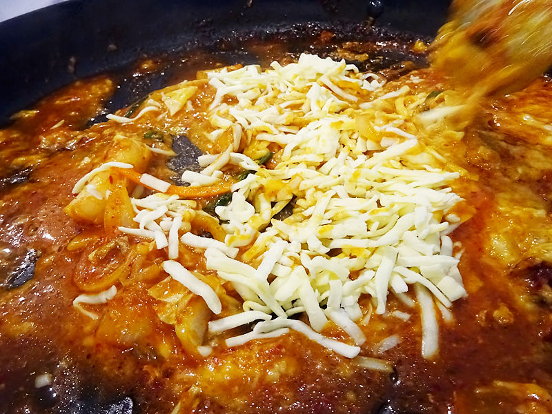 グツグツ煮立ってきたら、チーズをたっぷり投入!チーズが溶けたら食べ頃。
