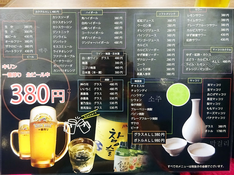メニューは手元パウチにて。キムチ、ナムルなどの前菜から、サラダ、一品、鍋もん、〆もんまでオール韓国料理。