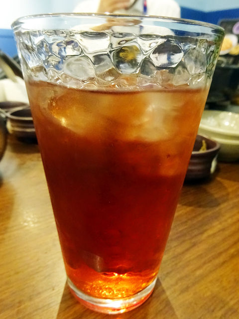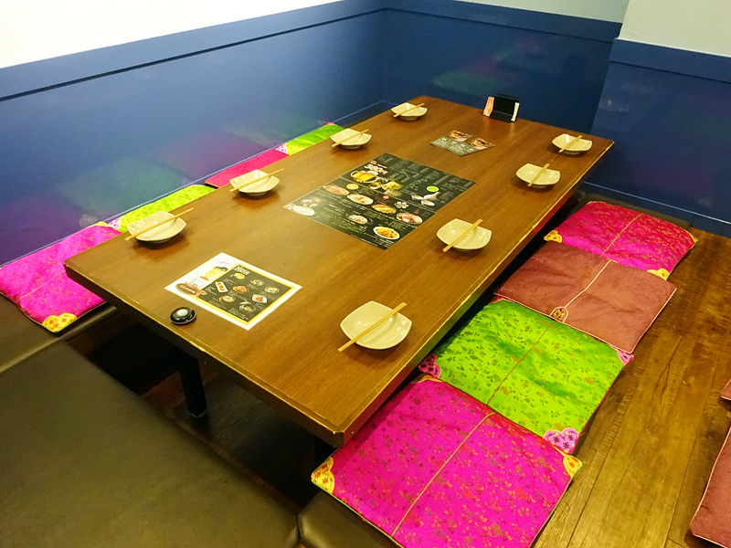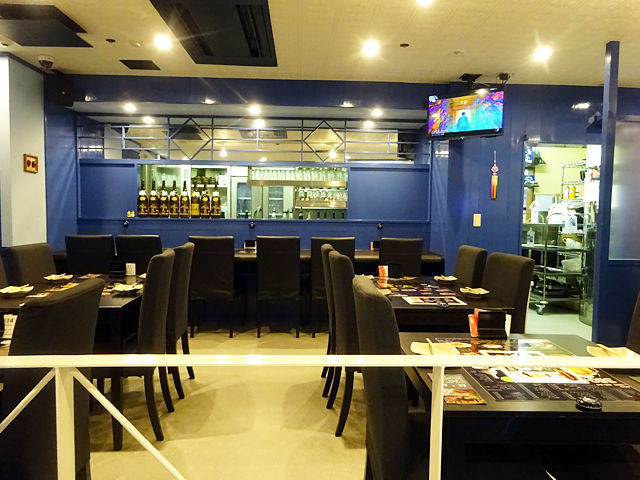 階段を降りた地下1F。店内はメインフロアのテーブル席と、奥の座敷(掘りごたつ)席。全体的にはブルーを貴重としたシンプルな雰囲気だけど、この座敷席だけ座布団が韓国っぽくて可愛い〜♪で、そのお座敷席にオジャマしまして。