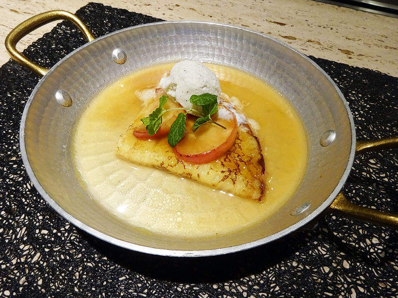 鉄板の〆デザートと言えば、クレープシュゼット。こちらも目の前でフランベされ美しい炎をあげ仕上げられました。