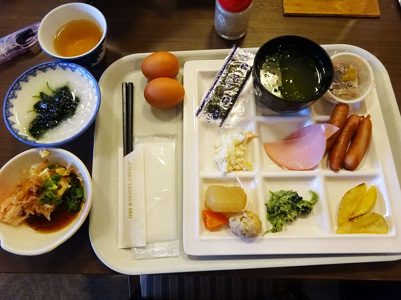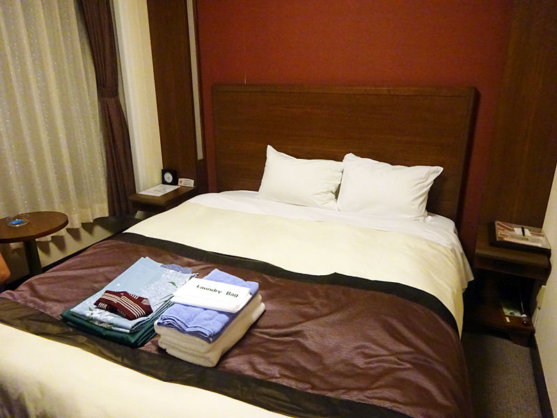 お部屋。ビジネスホテル風の小さめ、シンプルタイプ。寝るだけだから問題無し。Free WiFiあり。