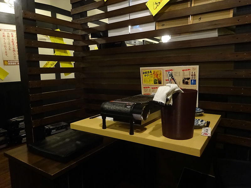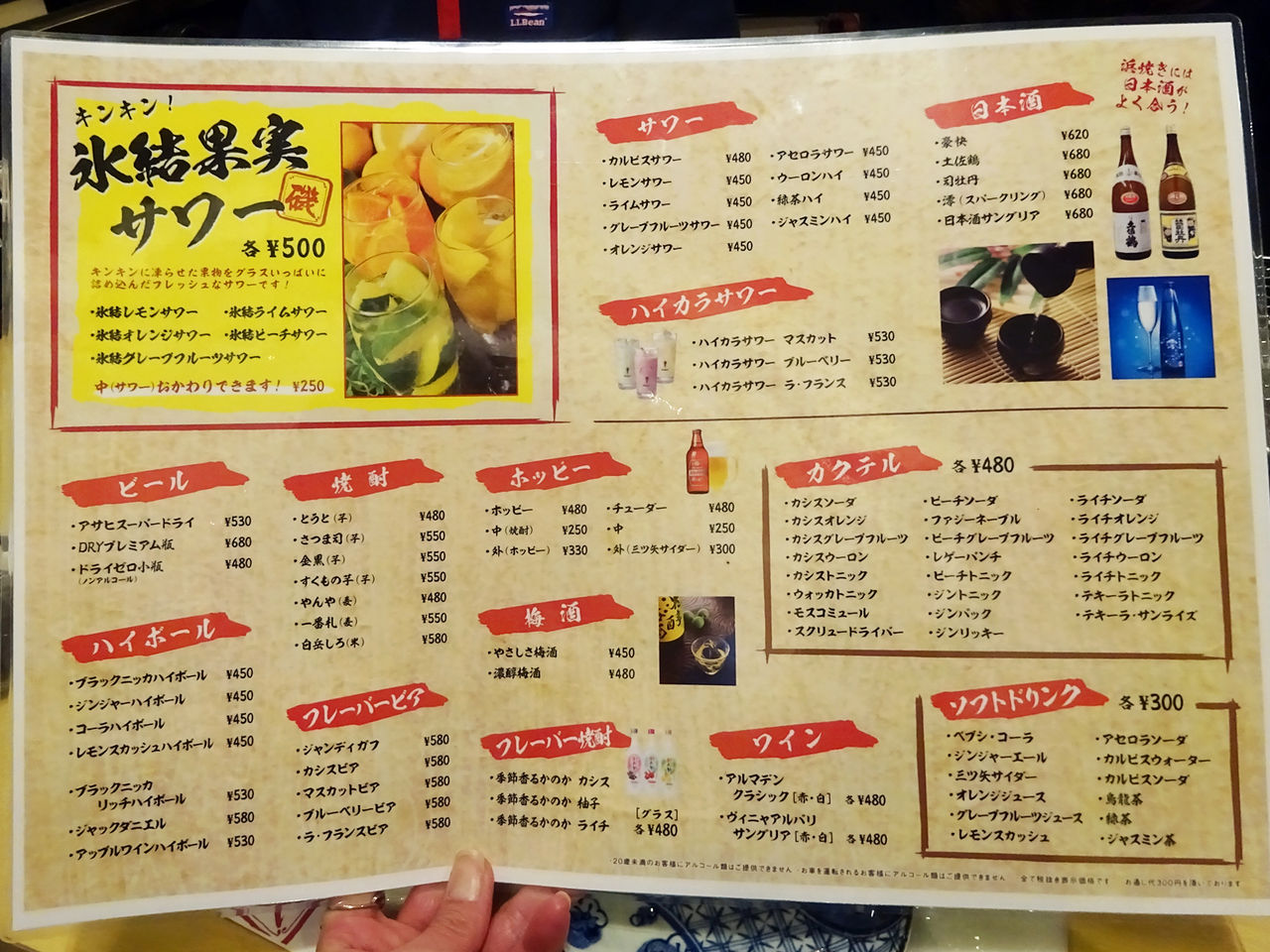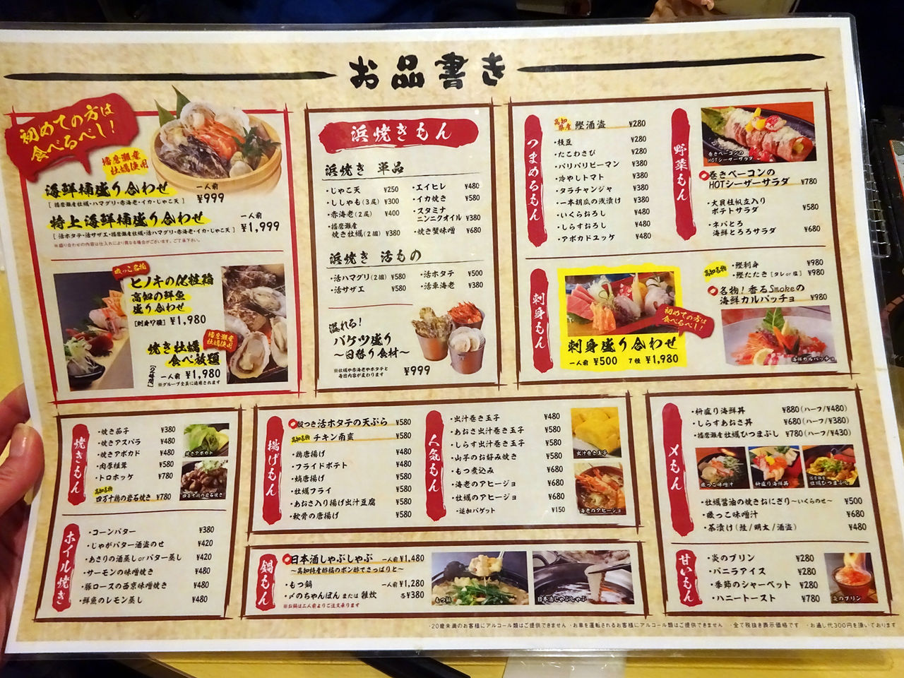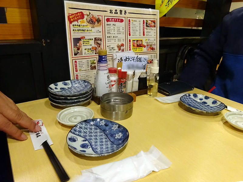 メニューは手元パウチにて。店名から察する通り、刺身、浜焼き、牡蠣などの魚介類がウリ!