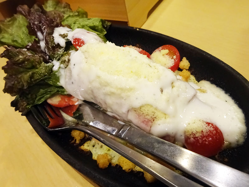 鉄板でサーブされてからのドレッシングがかけられ熱々ジュージュー!ナイフでカットしていただきます〜