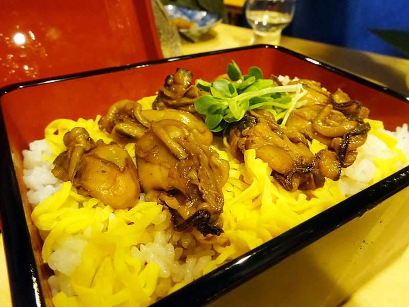 ご飯、錦糸玉子のベッドに甘辛く炊いた牡蠣オンザ。
