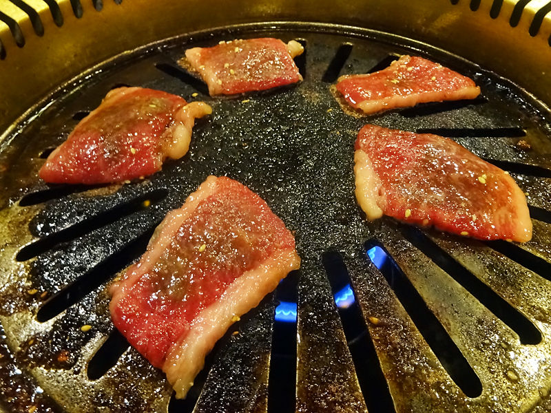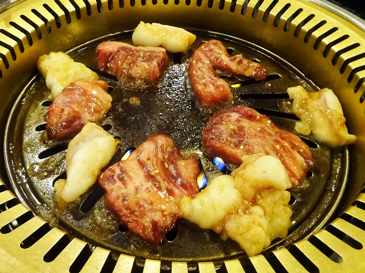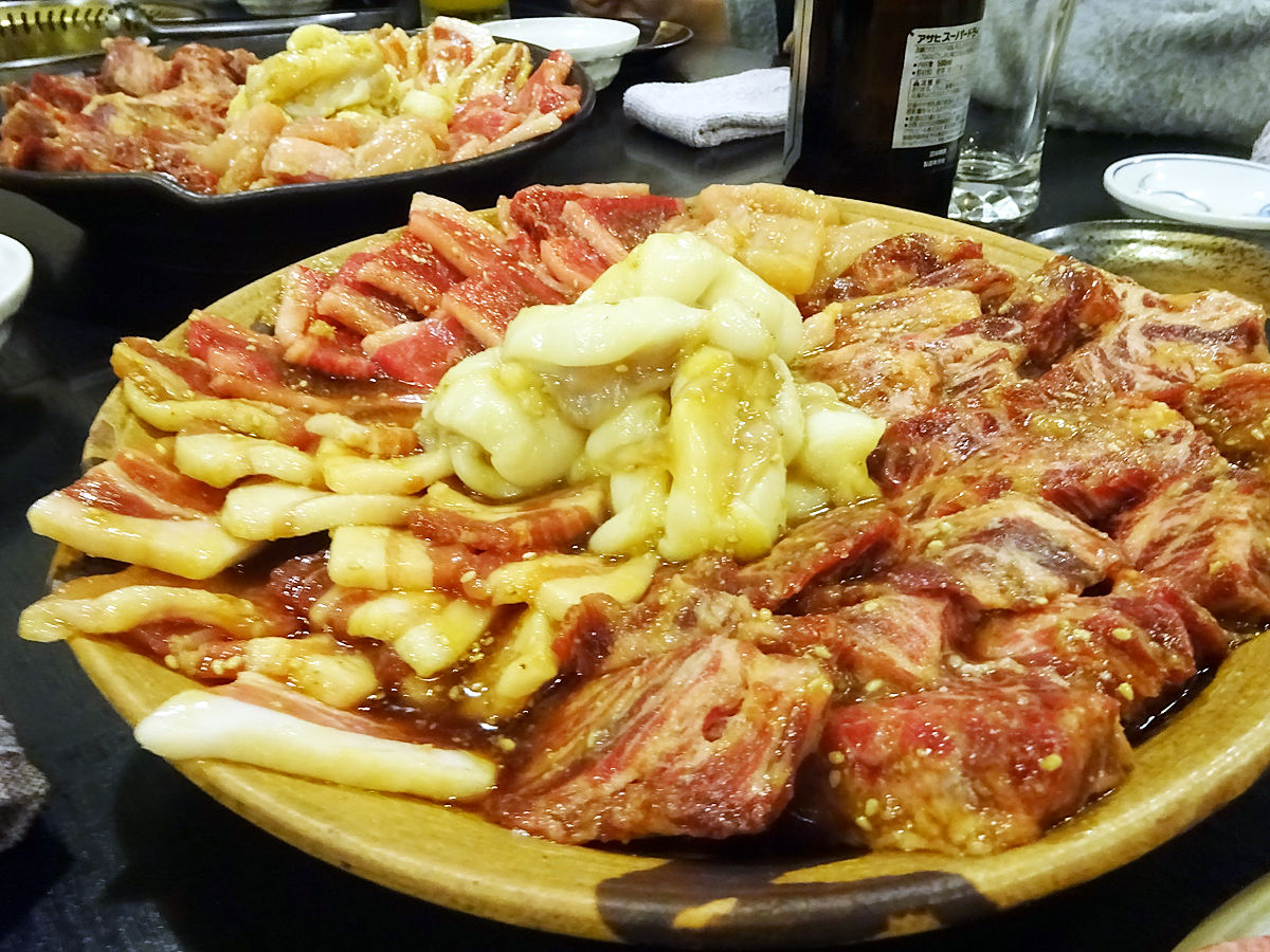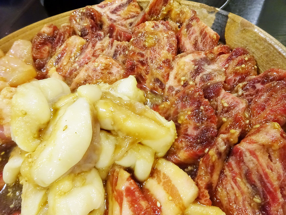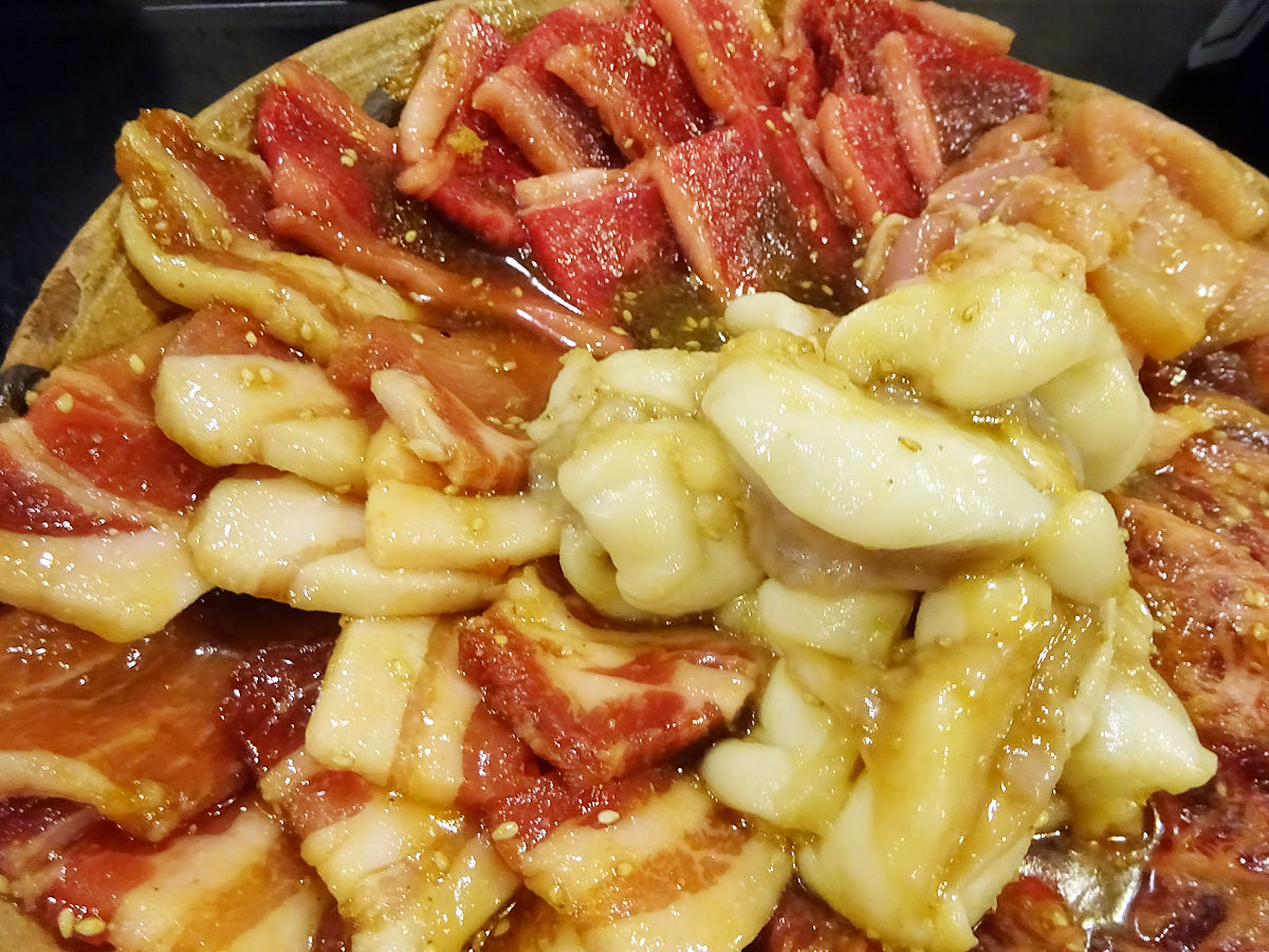 盛りの内容は説明がなかったのですが、ハラミ、小ホルモン、牛バラ、豚バラ、鶏もも肉、といったとこかしら。