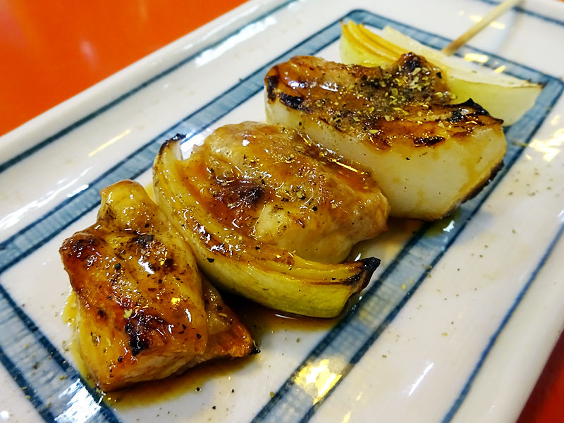 ネギではなく玉ネギが刺さったネギマ。山椒もいいねぇ。