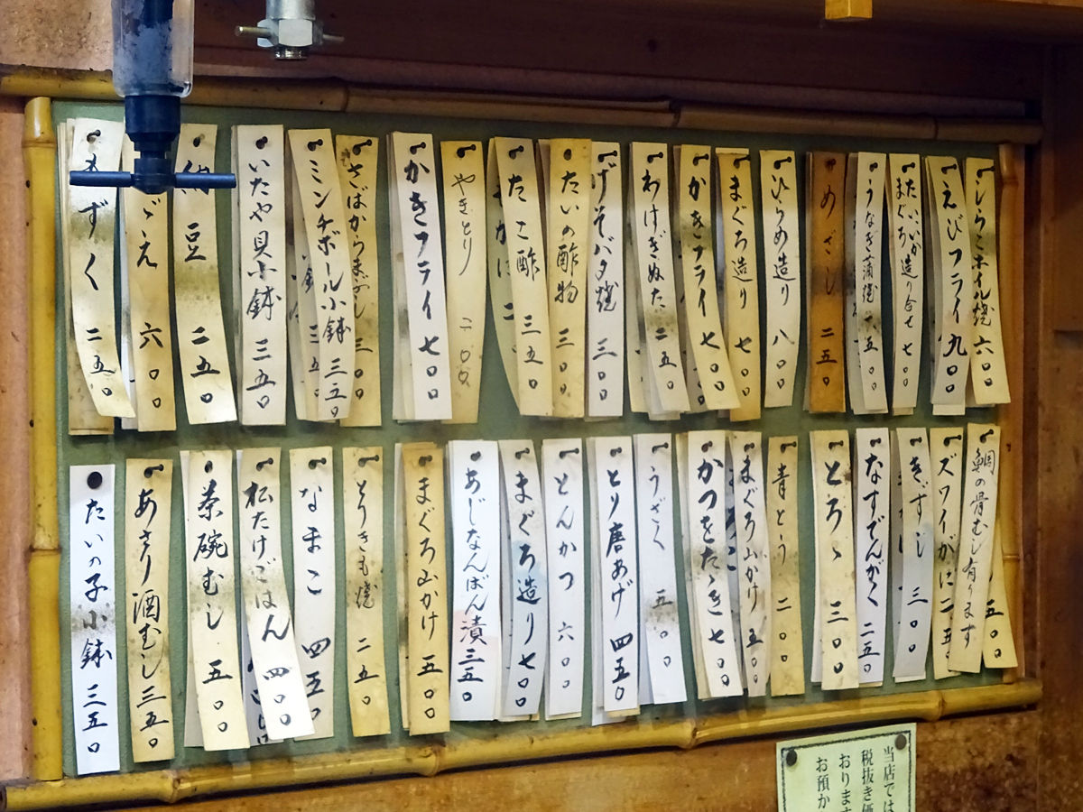 その他メニューは年季の入った短冊にて。酒場にしては割と高価なのものあるけど、¥300〜400台のものもあるのね。ホッ=3
