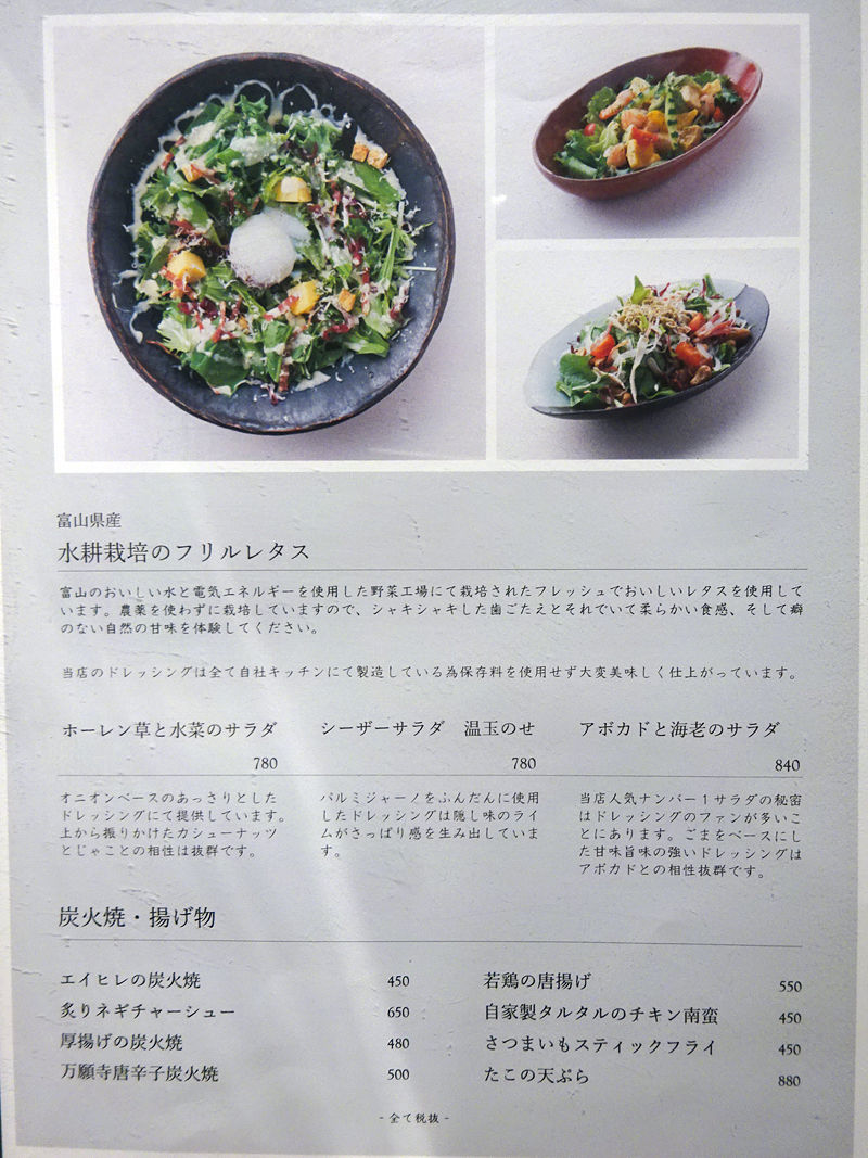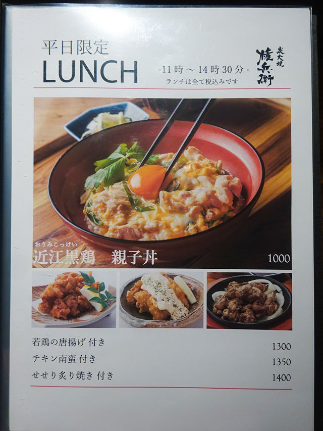 メニューは手元ブックにて。ランチは開店の11時から14時半まで。親子丼や唐揚げなど4種。その他、夜と同じアラカルトメニューも楽しめるので、昼酒だってOK!