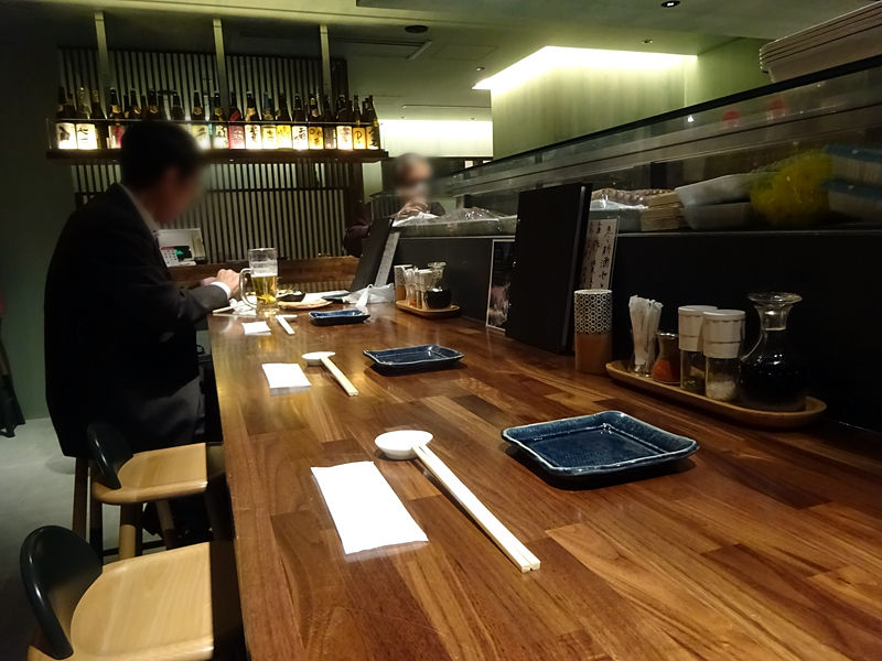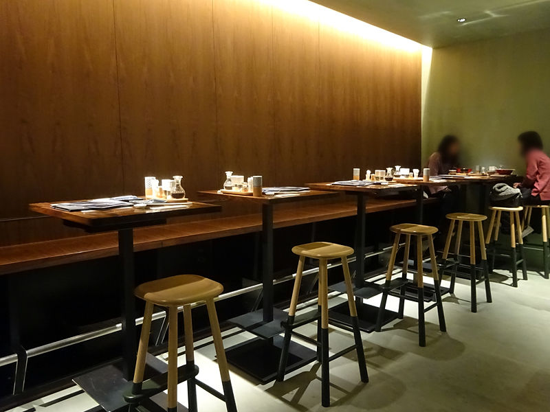 カウンターとハイスツールのテーブル席。シックで大人な雰囲気!オシャレ〜で。奥のカウンターにオジャマしまして。