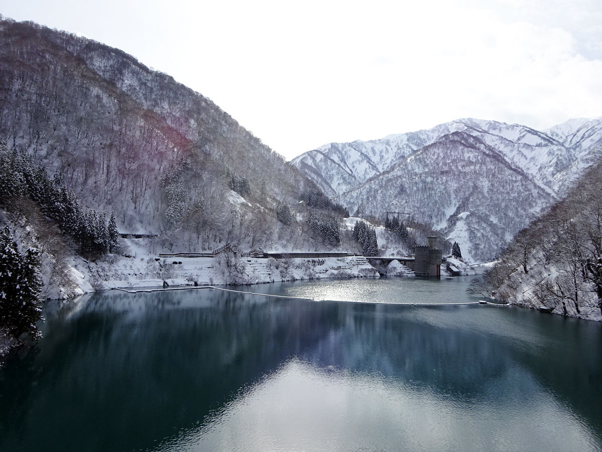 四方が雪に囲まれています。雪の黒部川、絶景。