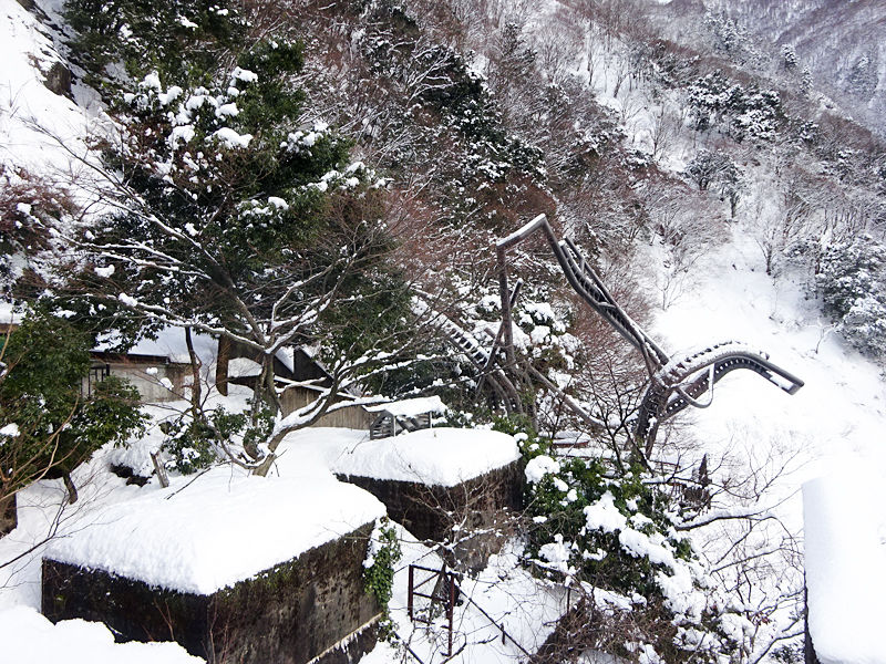 おもしろい形!黒部川を一望できる展望台ですが当然、閉鎖されています><積み上げられた雪を乗り越え入ろうと思ったけど無理でしたw