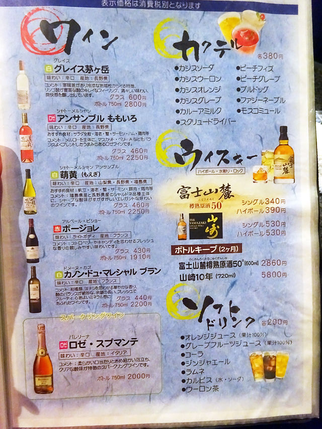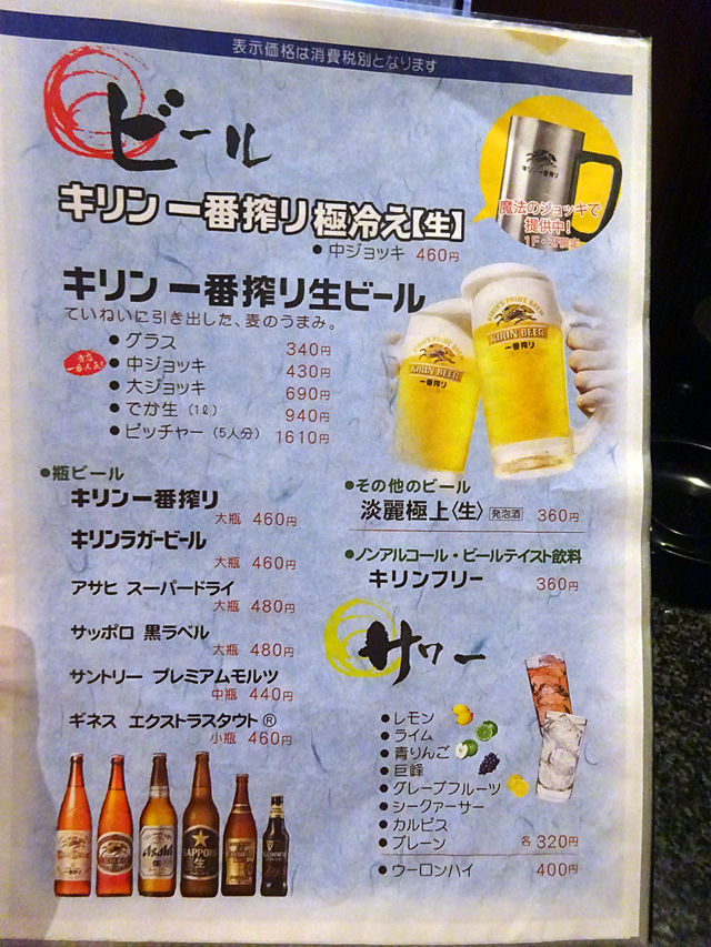 座りでこの価格はエライ!大瓶はその他一番搾り¥460、スーパードライと黒ラベルが¥480。メーカーによって価格が変わるのもおもしろいねぇ。あ、別にケチってラガーにしたわけではありませんよ!念のため…w
