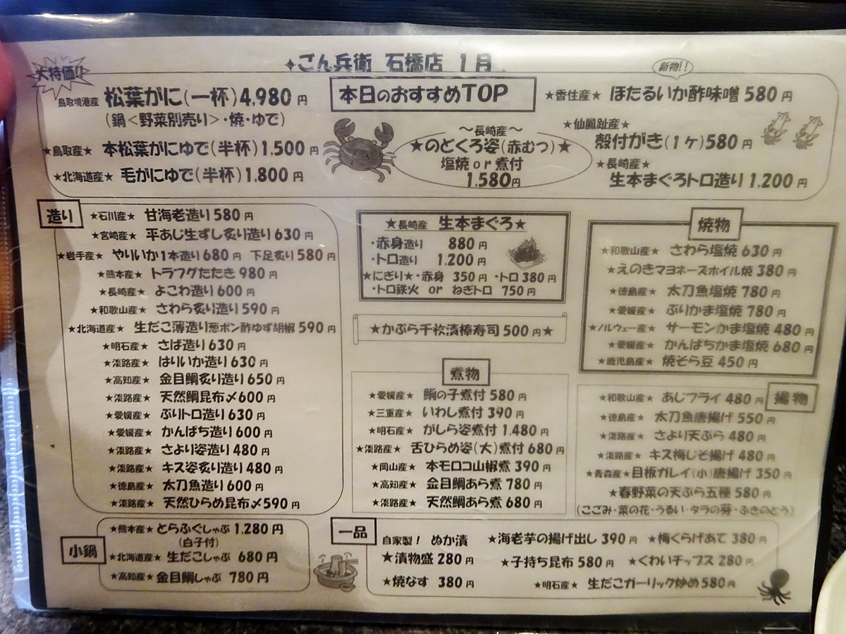 メニューは定番が手元ブックに、その日のおすすめや季節のおすすめが別パウチにて。一品、お造り、焼きもん、揚げもん、鍋、寿司、〆もん…何せ種類豊富!ブックはプリントアウトされた用紙がファイリングされるアナログ感がたまらない(笑)