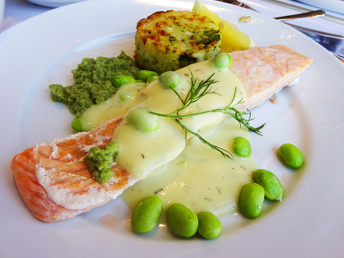 定番のミートボールやハンバーグ、ローストビーフなどのメインからチョイスしたのはサーモン。しっかり大きくて肉厚、ソースも旨いし添えられたベジタブルメダリオン(マッシュポテトをグリルした、ちょっとカタめのグラタン風みたい)も美味しい。好き。