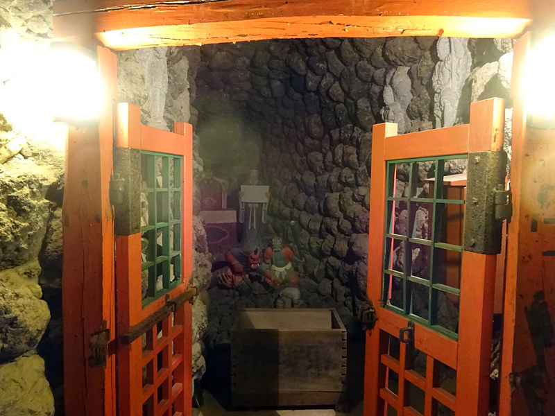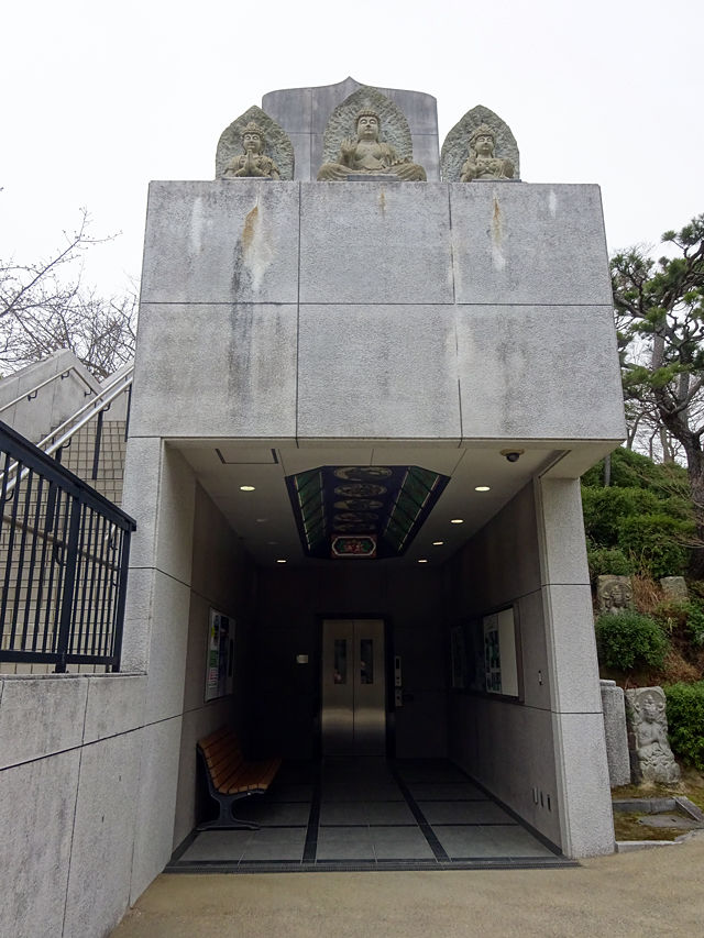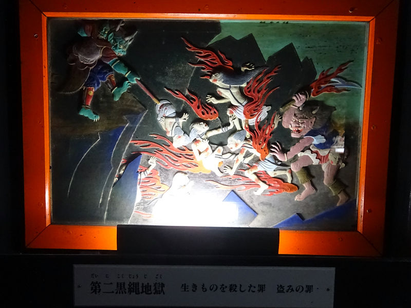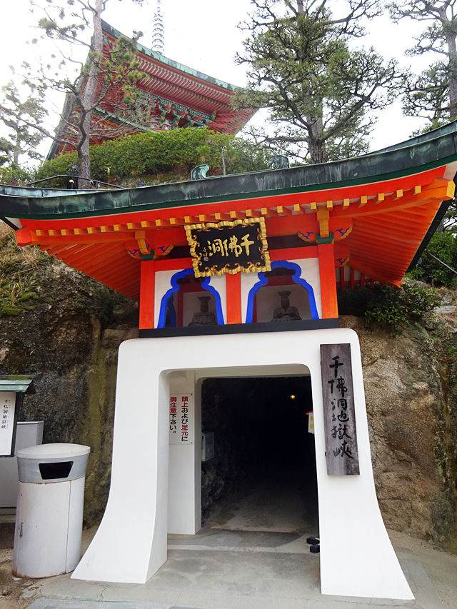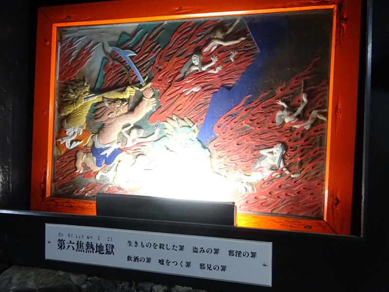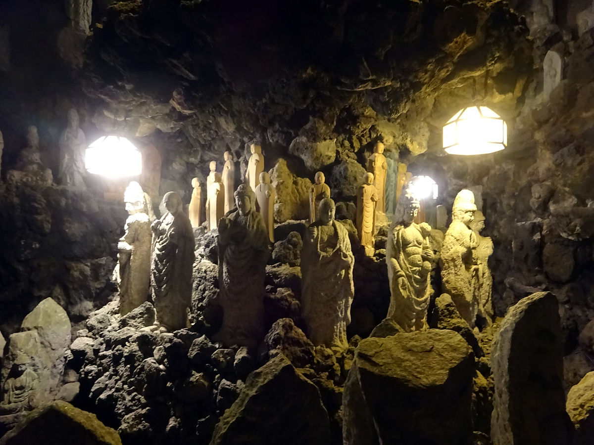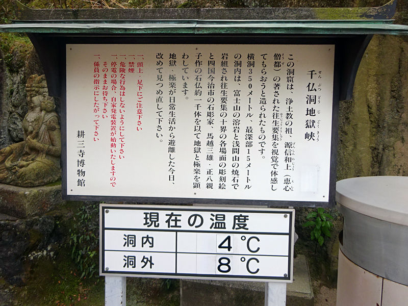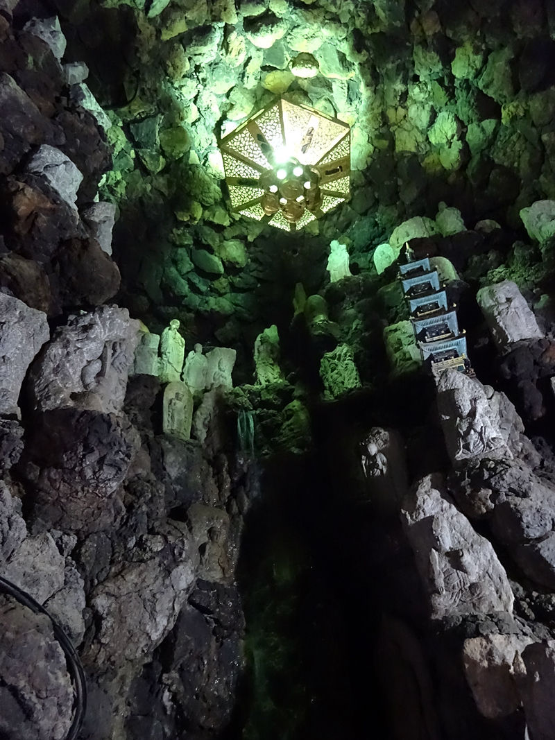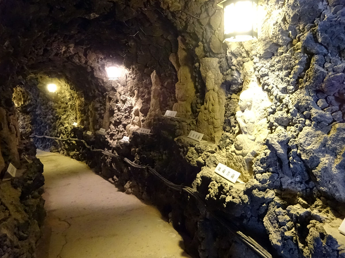 本堂横と先の救世観音大尊像そばの入り口でつながる、地下15m、全長350mもの洞窟。浄土教の祖・源信和上著の『往生要集』を視覚体感できるそう。