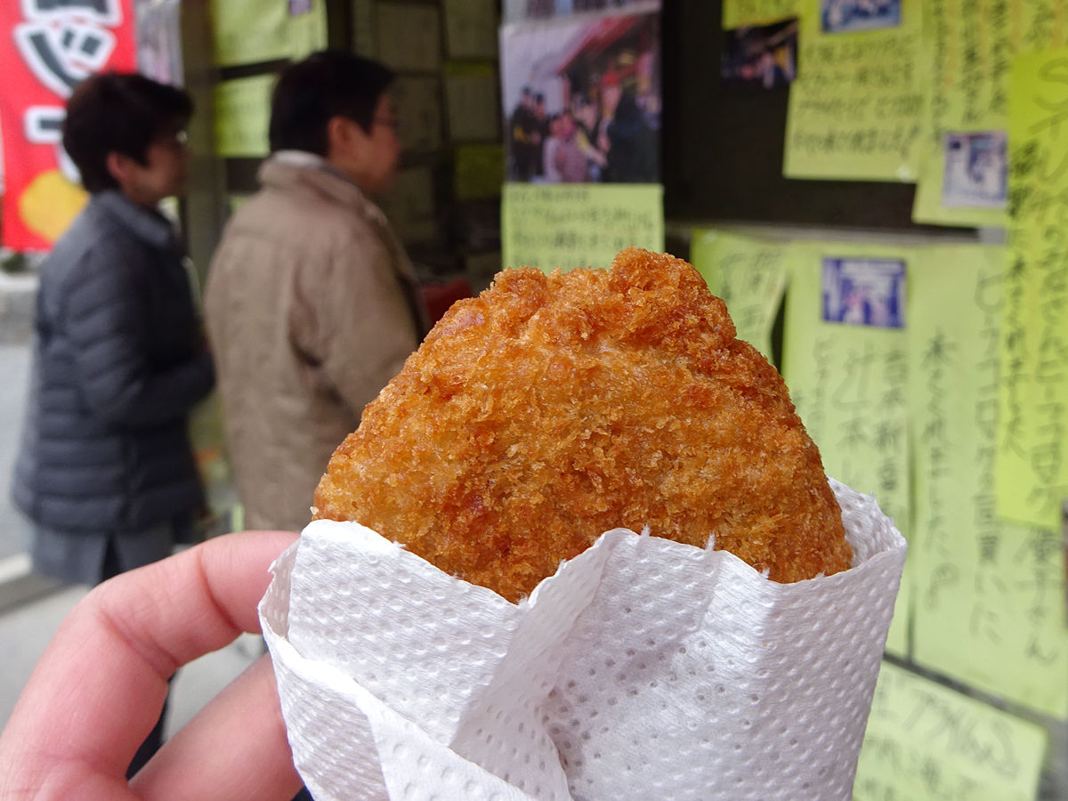 肉屋さんのコロッケ!な、ちょっと甘い感じで美味しい♪揚げたてならなお良かったんだけど、、、。有名人も多数来られているようで、界隈の人もいくつも買っていっていましたよ〜