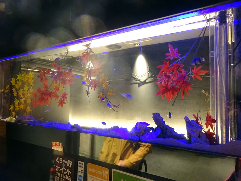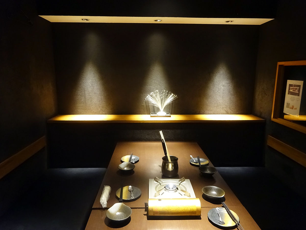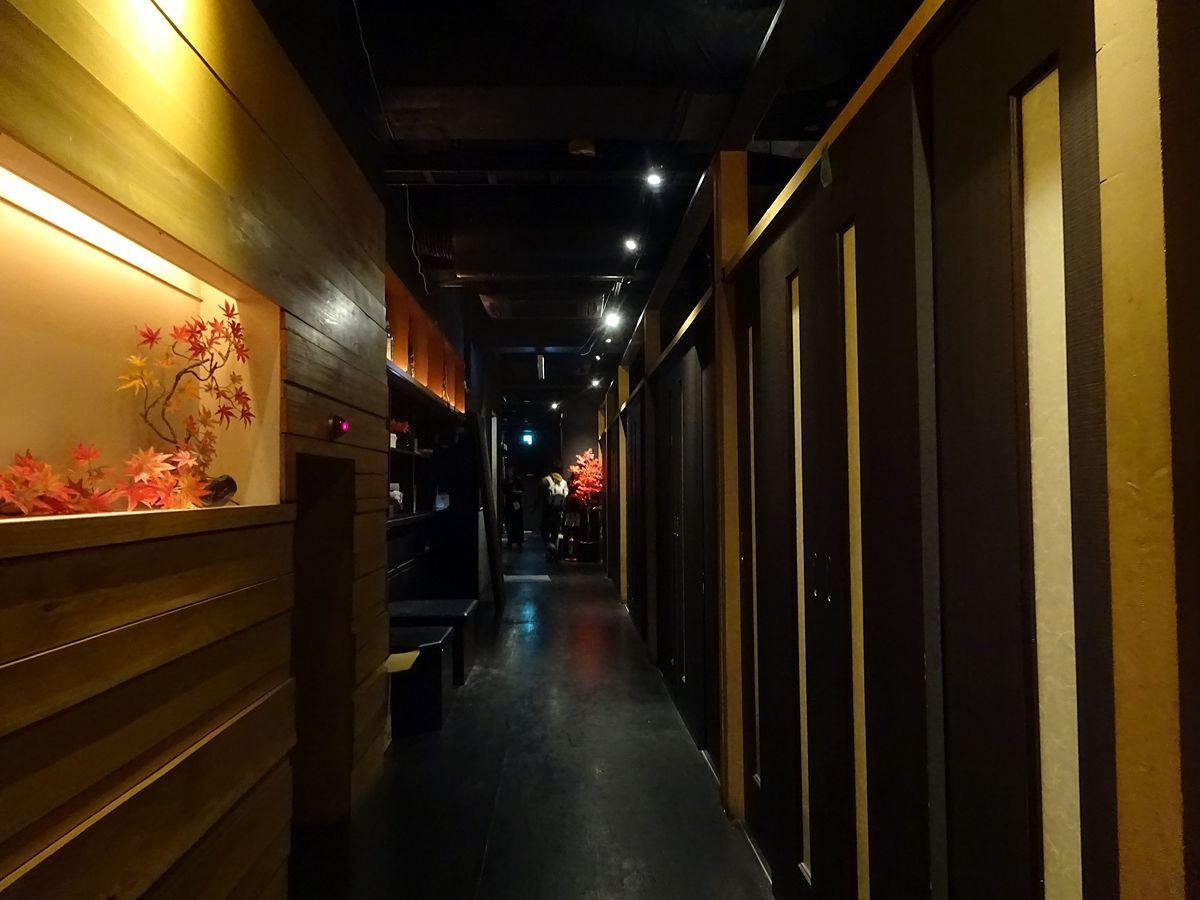 ガラス扉を開け入ると、大きな水槽がお出迎え。からの、長い通路に個室が並びます。木と黒を貴重とした落ち着いた雰囲気です。