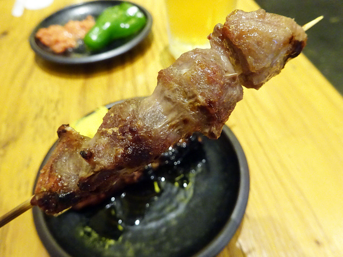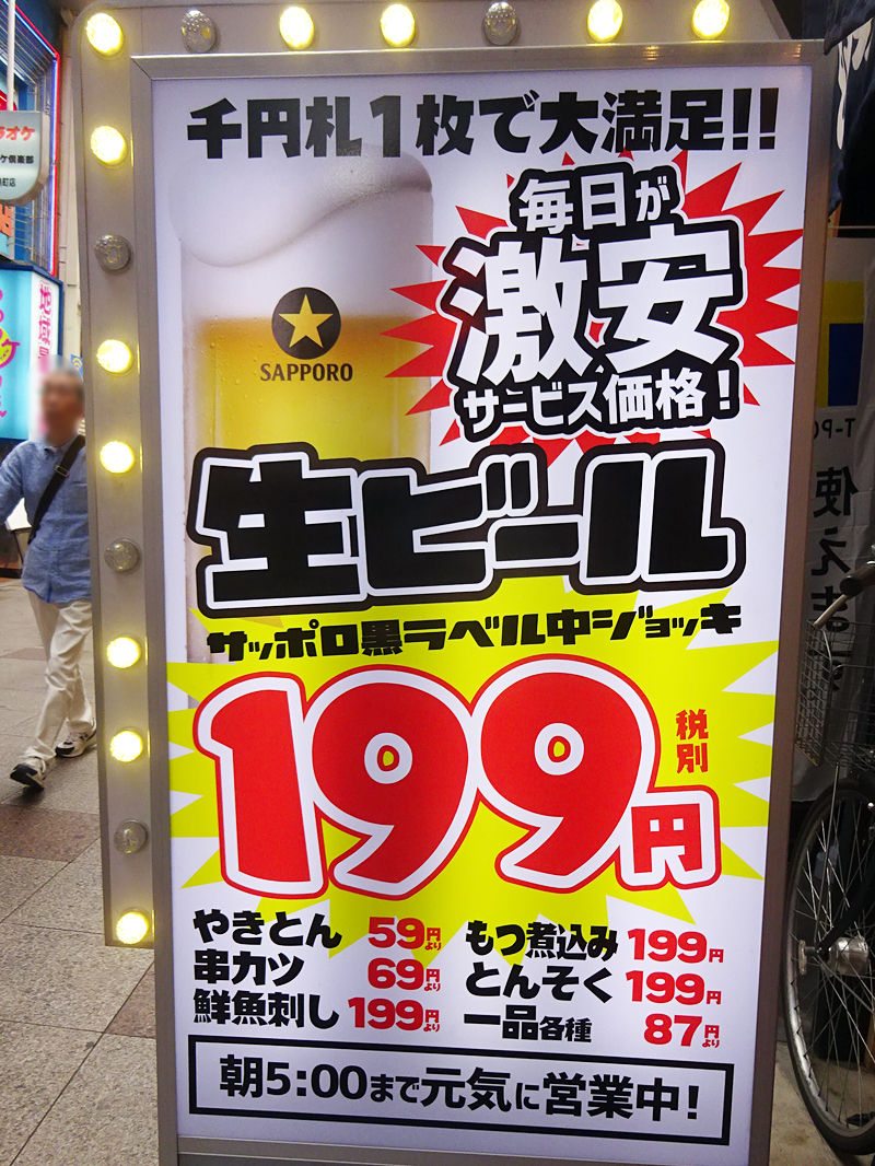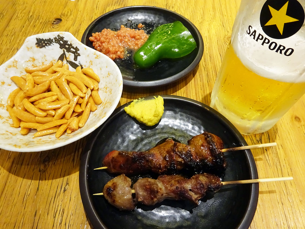 メニューは手元パウチにて。店名暖簾よりデカデカと掲げられる通り、生ビール毎日終日¥199!(税別)これを狙ってきたんですよ、ハイ。その他、酒ひと通り(とりわけ、酎ハイ・サワーが豊富)。アテはやきとん、串カツ、揚げもん、一品、〆もんまで豊富。且つ、¥100、¥200台がメインで安い!