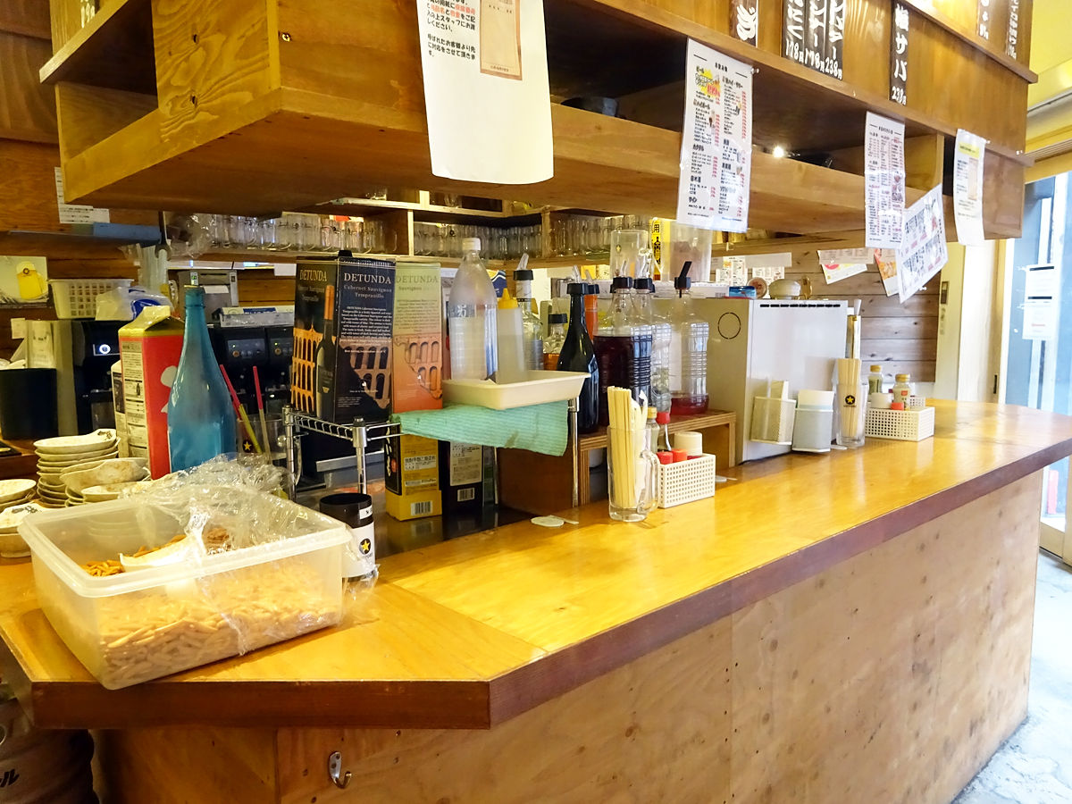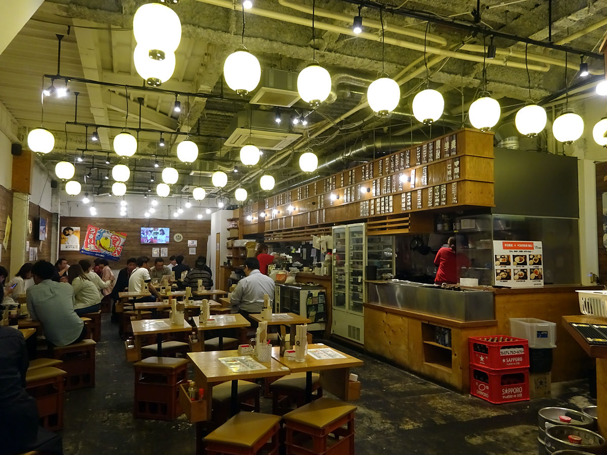 戸を開け入った店内は、手前に立ちカウンター、その脇にも小さい立ちテーブル席、その奥にメインフロアのテーブル席と、割とキャパでかめ。天井からぶらぶら下がる提灯に、ビールケースをひっくり返した椅子などなど、レトロ感を模してます。