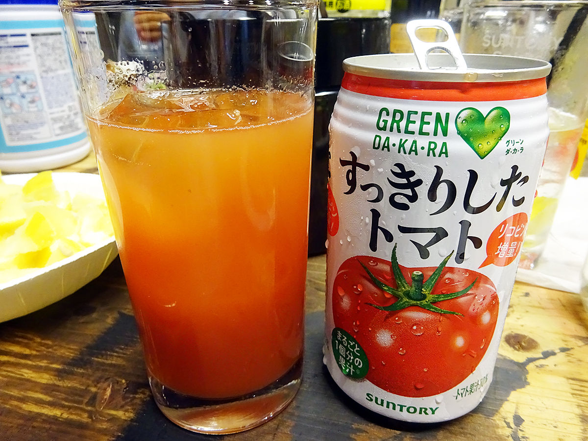 トマトジュースでリコピン摂取!これ美味しい!使用したのはサントリー【GREEN DA・KA・RA<すっきりしたトマト>】、自動販売機でしか売ってないらしいのだけど。100%トマトジュースではないので、サラッとしていて割材にピッタリ。