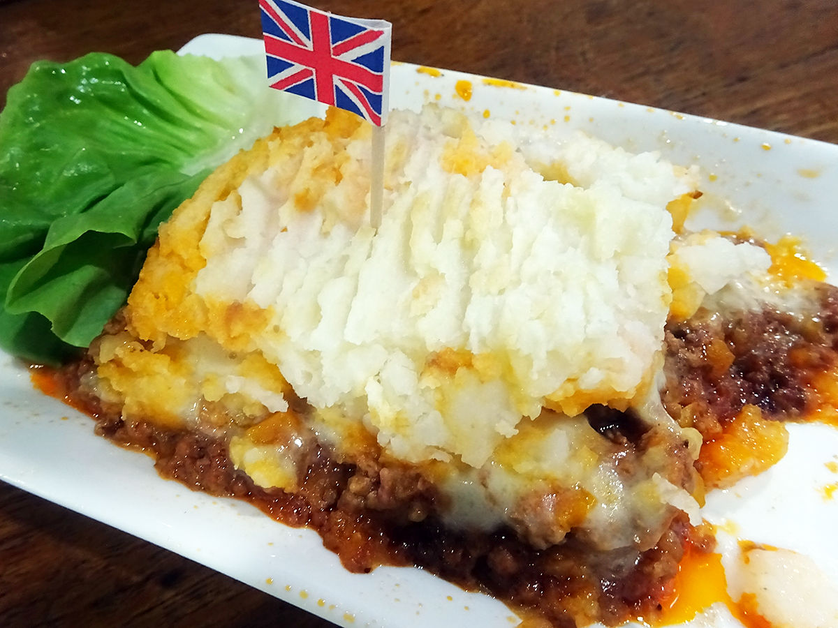 ロンドンパブ料理というカテゴリの中からこちら。ホクホクポテトの下にはスパイシーなひき肉たっぷり。ウマーイ!!