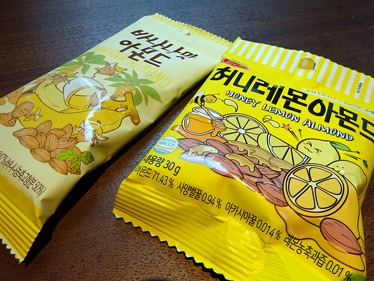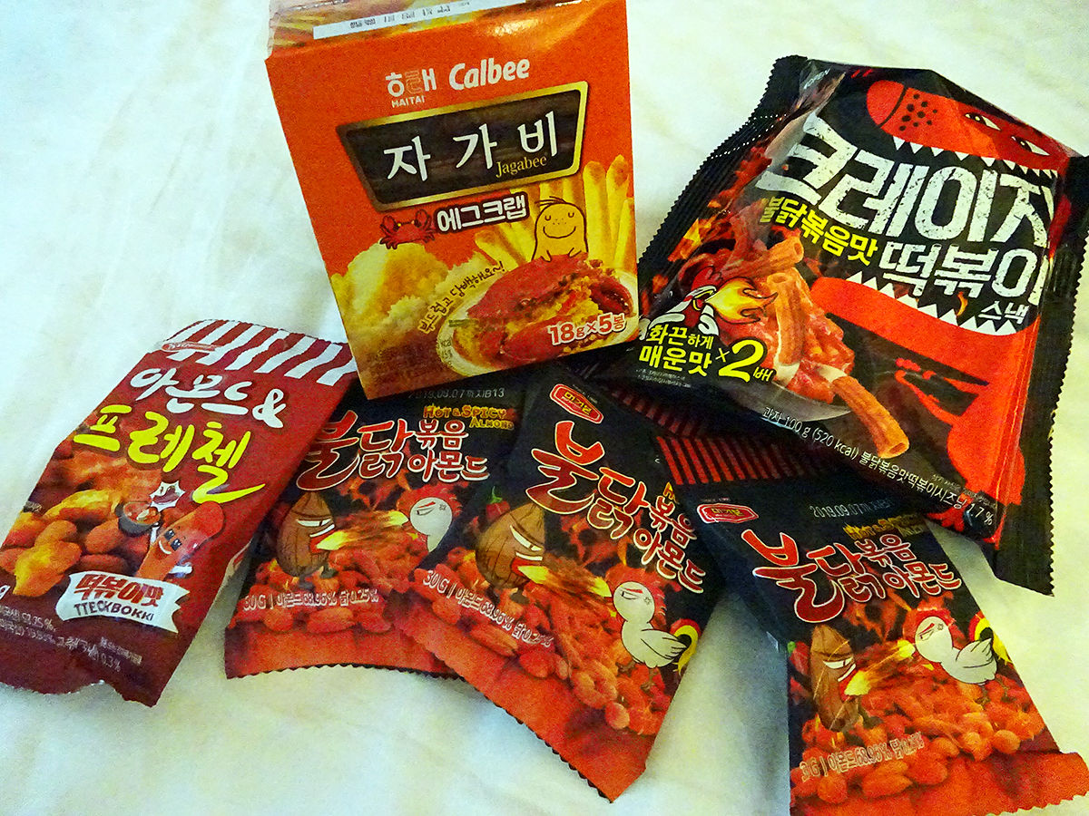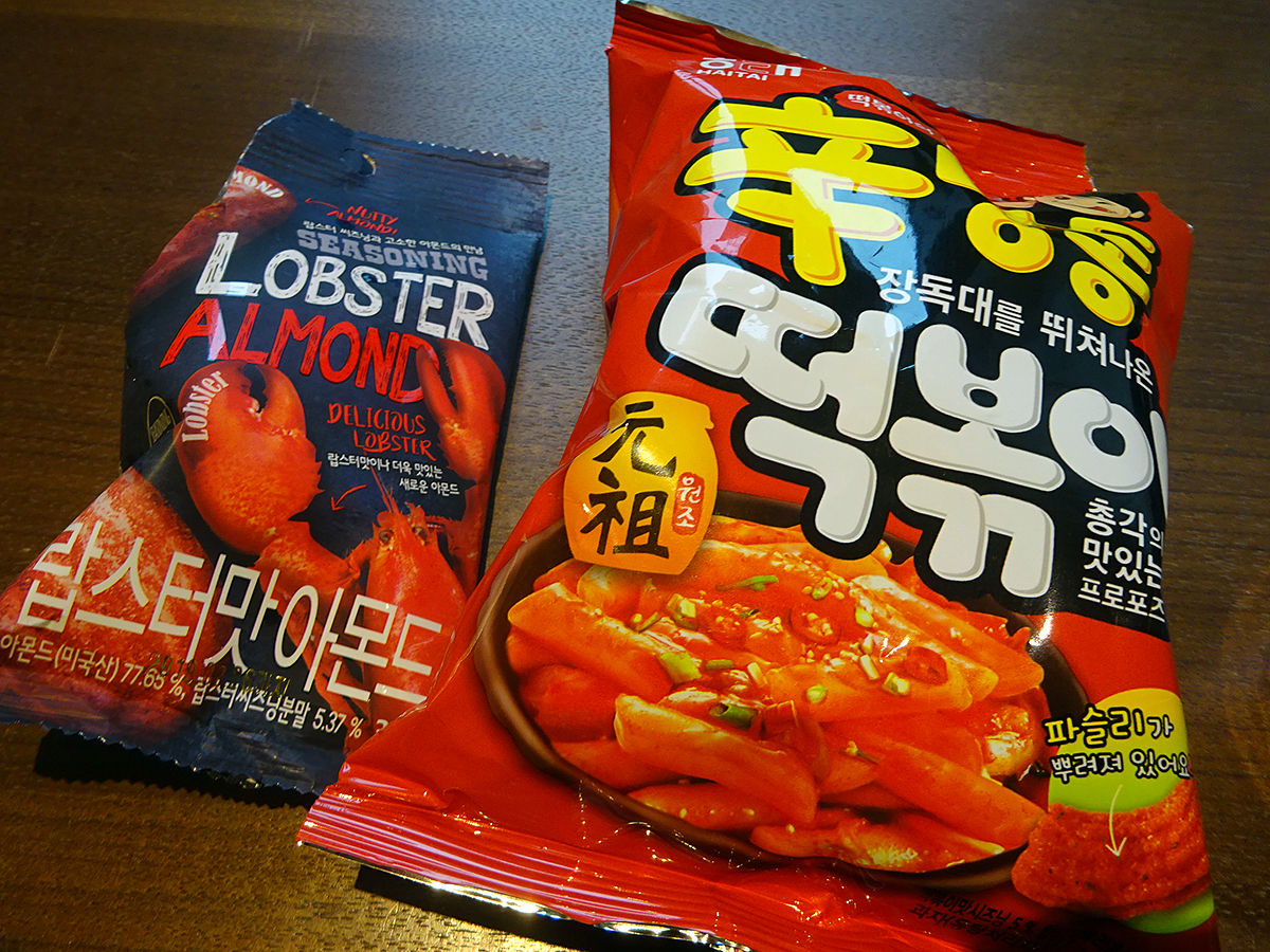 アーモンドもスナックもジャガビーもコチュジャン系の甘辛味。お菓子になったトッポギも色々あって。どれが良いのか全然わからんw