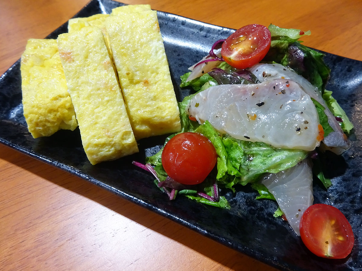 カンパチのカルパッチョ、カニ身入り卵焼き