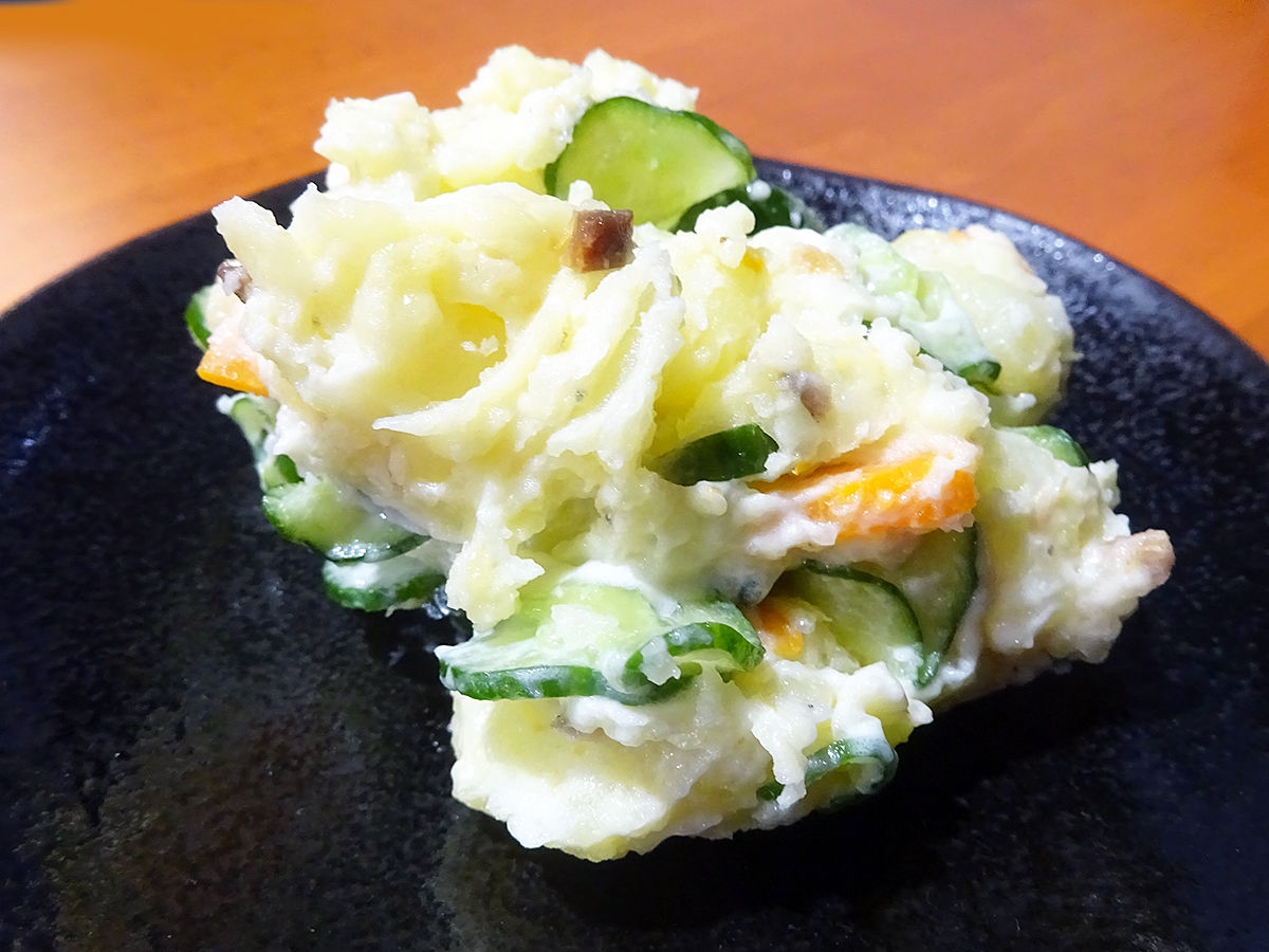 へしこがちょっと入るだけでグッと旨味が増して、酒に超合う一品に!ツナ入りが子供向けならコレは俄然、大人向けなポテサラ。