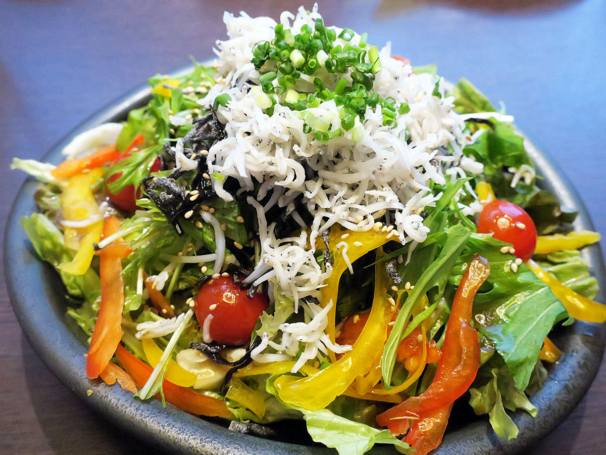 これも予想外のボリューム!水菜やレタス、パプリカ、トマトに塩昆布、たっぷりのジャコ…ってより、シラス!嬉しい裏切り!ワサビのきいたさっぱりドレッシングも良い。おいしい〜モリモリムシャムシャ食べる。