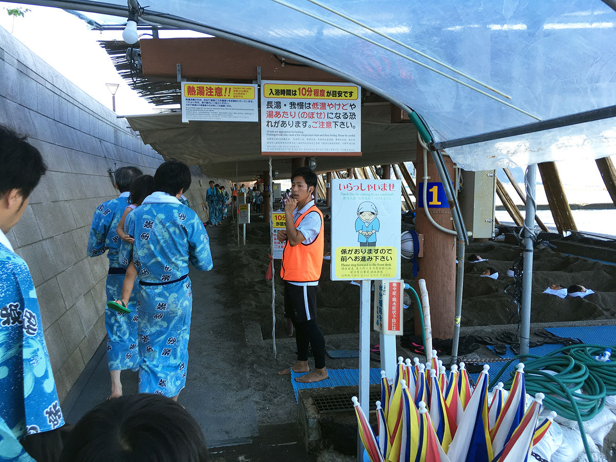 終わったら来た道を戻り、また別の入り口からシャワールームへ。そこで浴衣を脱ぎシャワーを浴び砂を落とし、温泉でゆっくりして終了。