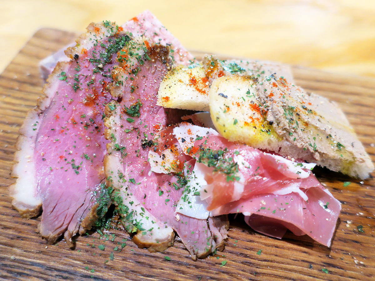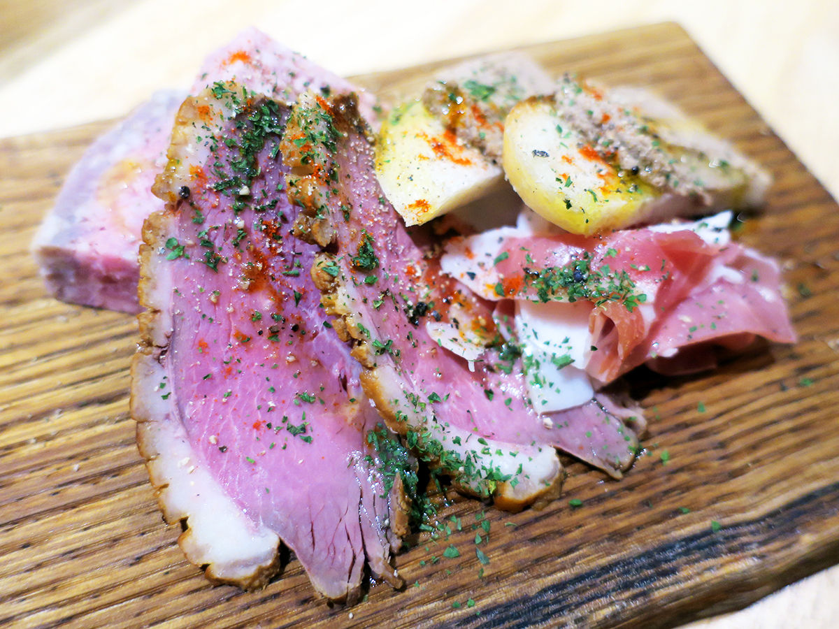 鴨のくんせい、生ハム、パテドカンパーニュ、白レバーペーストの4種。もちろんウマイ。